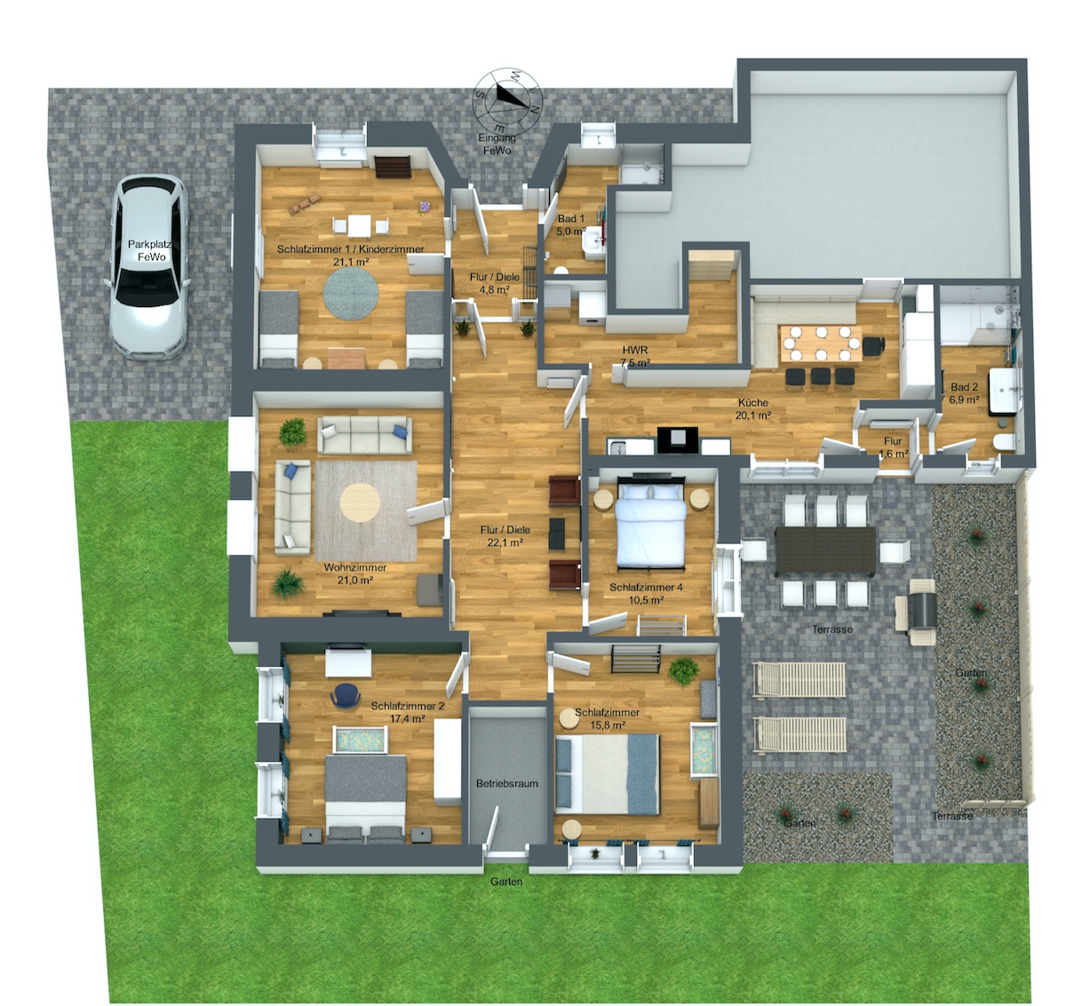 Unsere Ferienwohnung bietet Ihnen auf 150 Quadratmeter Platz für 8 Erwachsene und 2 Kleinkinder / Babys.