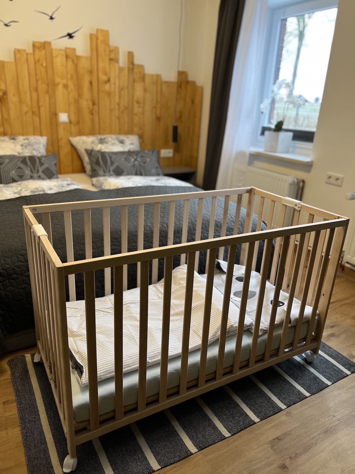 - Schlafzimmer 1 (Doppelbett 1,80m x 2,00m, Kinder-/Babybett zustellbar 0,60m x 1,20m)